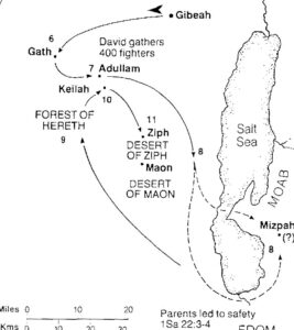 At one point Saul’s men were on with side of a mountain and David and his men were on the other. However, they were surrounded by Saul’s men without a way to escape. By “coincidence” a message arrived to Saul that the Philistines were raiding Israel again, so Saul hurried away with his army to address the bigger threat. David named the place “Rock of Escape.”