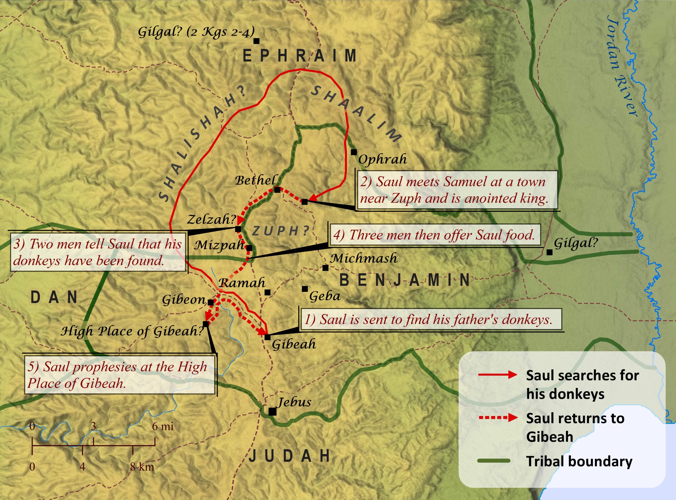 Some of Kish’s donkeys became lost so Kish sent out his son, Saul, with a servant to find them. They searched the regions of Shalishah and Shaalim. We don’t know for certain where these locations are. We know Saul’s home was in Gibeah (I Samuel 11:4). His route took him along the hills of Ephraim, which is a ridge that extends into Benjamin’s territory. Most assume Shalishah is related to Baal-Shalishah (II Kings 4:42), which was located 12 miles north of Lydda, west of Ramah toward the border of Dan. Shalishah means “three land” and there is a location in that area where three valleys come together. They then go to Shaalim. Since it mentions that Saul comes back to Benjamin’s territory and that Shaalim is in Ephraim’s territory. Finally, they reach Zuph. I Samuel 10:2 mentions that they would go near Rachael’s tomb, which is located at Zelzah, near Bethlehem, south of Jerusalem, so it is assumed they ended up somewhere in the southwest section of Benjamin.