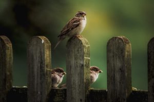 "Sparrow" is the name given to several different species of birds in the Bible -- they ate grain and insects and gathered in noisy flocks. Sparrows would often build their untidy nests in the eaves of houses but were not driven away when they built their nests in the Temple (Psalms 84:3). These insignificant little birds were such social creatures that a lone sparrow was the symbol of deep loneliness (Psalms 102:7).