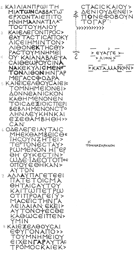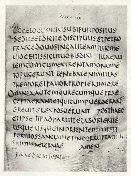 - Codex Bobiensis (c. 430) - besides including the Short Ending and not 16:9-20, this Latin manuscript's text of Mark 16 also adds an interpolation describing Christ's resurrection and ascension after 16:3, presents the angel saying that he will be seen in Galilee, and removes part of 16:8.