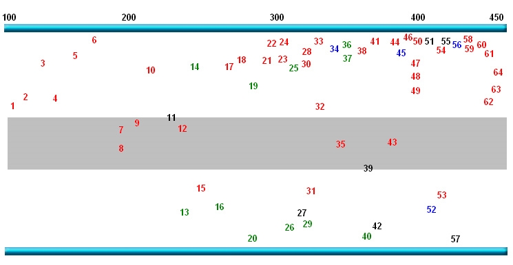 The following chart depicts 64 pieces of evidence, all of which are texts as old or older than Codex Ephraemi ("C"), the fifth-oldest Greek manuscript of the Gospel of Mark. The more a witness supports Mark 16:9-20, the higher it is placed on the chart. Some witnesses, which are essentially silent, are placed in the grey area in the middle. Chronology is given from left (beginning at A.D. 100) to right.