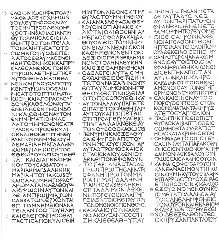 This is a hand-made replica of the last page of Codex Vaticanus. The verse-numbers in the margins are not present in the manuscript; I added them for the sake of convenient reference. In Vaticanus, the text ends in the middle column, and is followed by an ornamental line and, further down, the subscription "KATA MARKON" ("according to Mark"). The third column is blank.