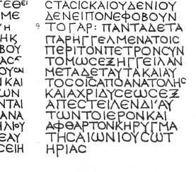 This hand-made replica below shows the arrangement of the text in columns 9 and 10 of the four-page (16-column) cancel sheet at the end of Mark in Sinaiticus. Mark's text from 15:19 (which appears earlier in the cancel sheet, in column 5, line 11) onward has been stretched so as to fill more space than it normally would. However, from column 4, line 1 to column 5, line 10, the text was written in a compressed script, with the result that column 4 contains 707 letters. If the copyist had continued to write compactly, the cancel sheet would have had plenty of room for the Long Ending. (However, if the copyist had continued to write so as to average 635 letters per column, if he had tried to write the Long Ending he would have reached the end of column 10 with 206 letters to go. Thus it is practically certain that the original pages of the end of Mark in Sinaiticus did not contain the Long Ending.)
