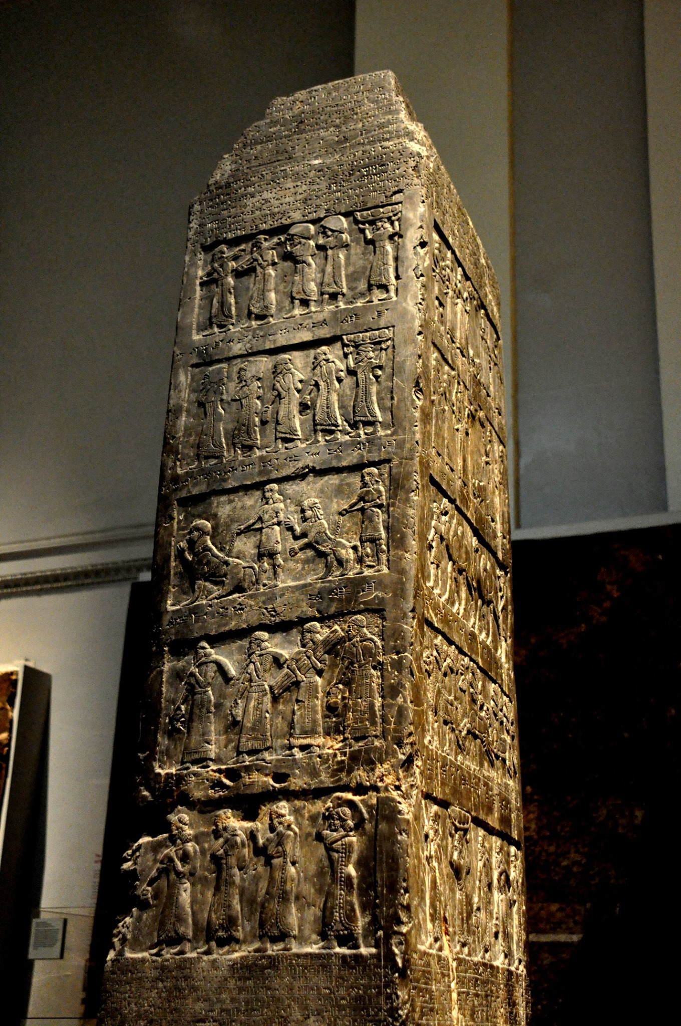 The obelisk was erected as a public monument in 825 BC at Nimrud (ancient Kalhu) in northern Iraq. It was likely erected at a time of civil war (Taylor). It is housed at the British Museum in London.