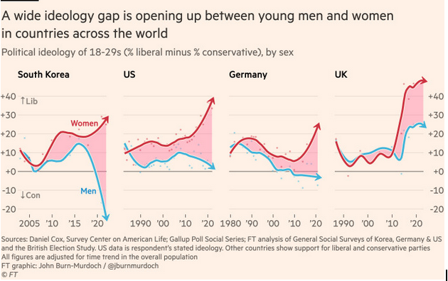 A short time ago, browsing my Reddit feed, I came across a post on the r/GenZ subreddit that caught my attention. It was titled “Gen Z girls are becoming more liberal while boys are becoming conservative". It included a line graph featuring an ever-increasing ideology gap between young males and females in various first-world countries. This graph (as shown below) originated from the Financial Times article “A New Global Gender Divide is Emerging.”